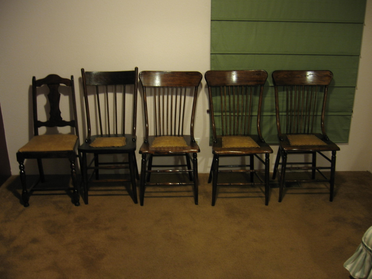The chairs were grimey and I cleaned them up. That is when I realized that these chairs must have fallen off a pick up truck, at a high rate of speed, like on the freeway. We took them apart and added missing spindles and glued them back together.